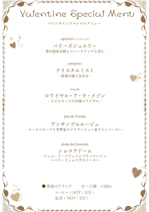 バレンタインスペシャルメニューとして、特別なコース料理(お一人様3,500円)がお楽しみいただけます☺